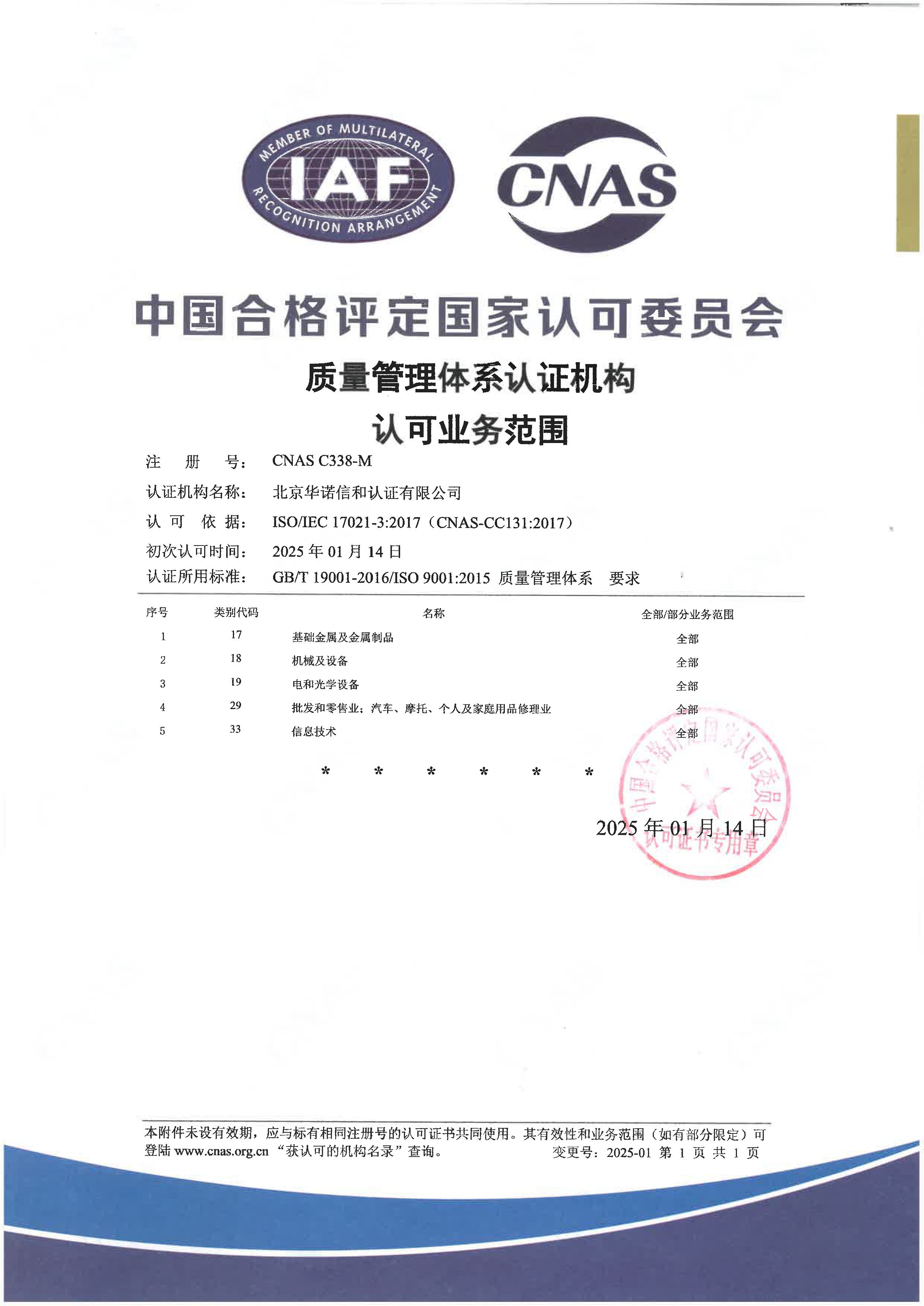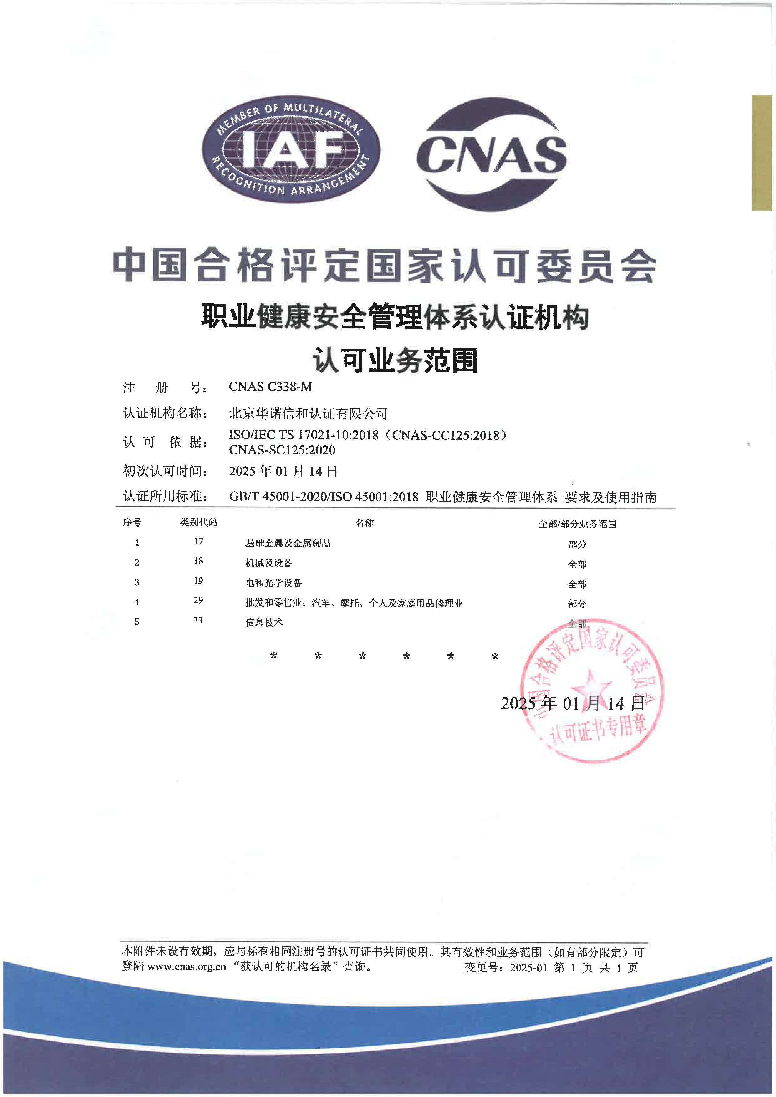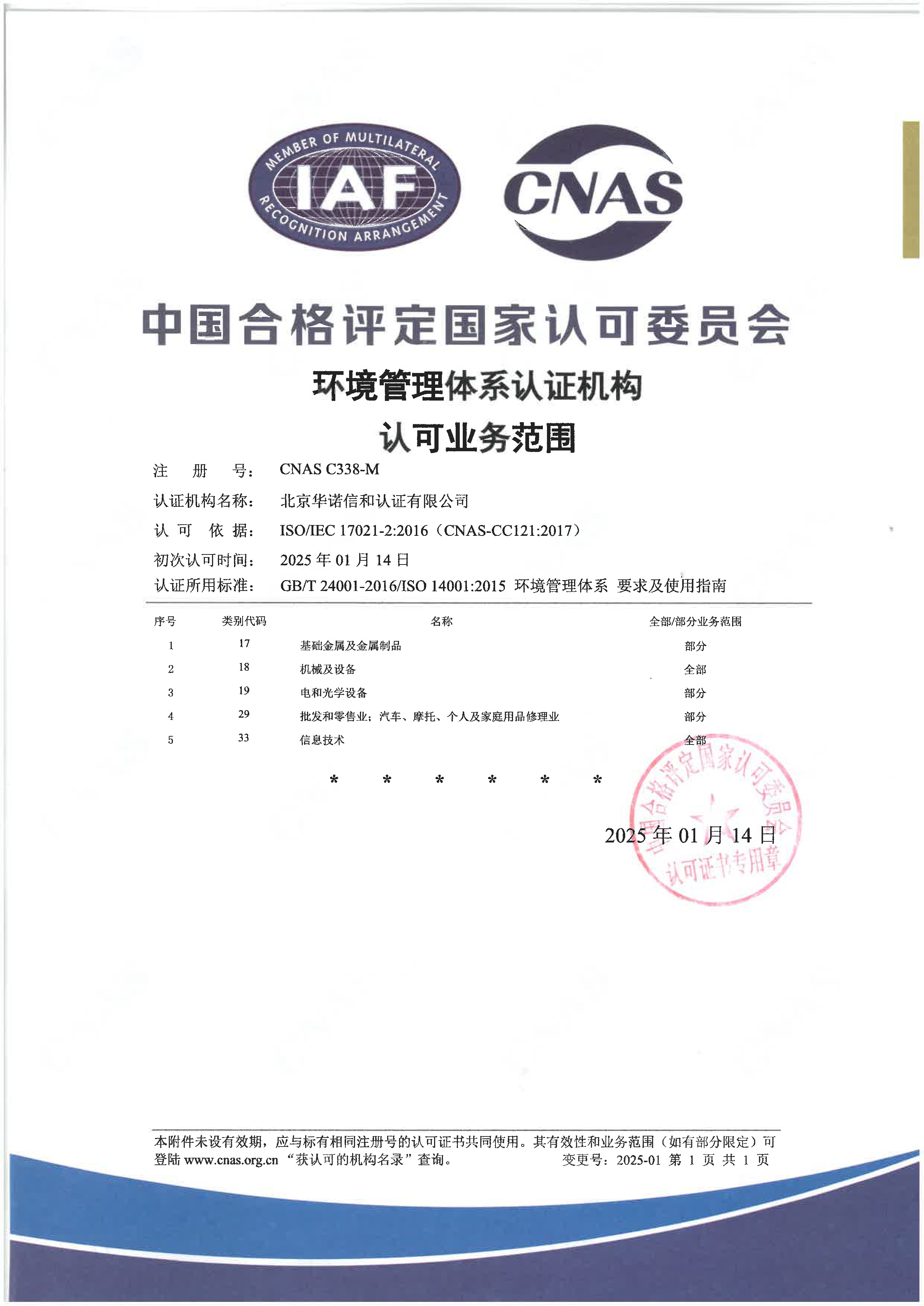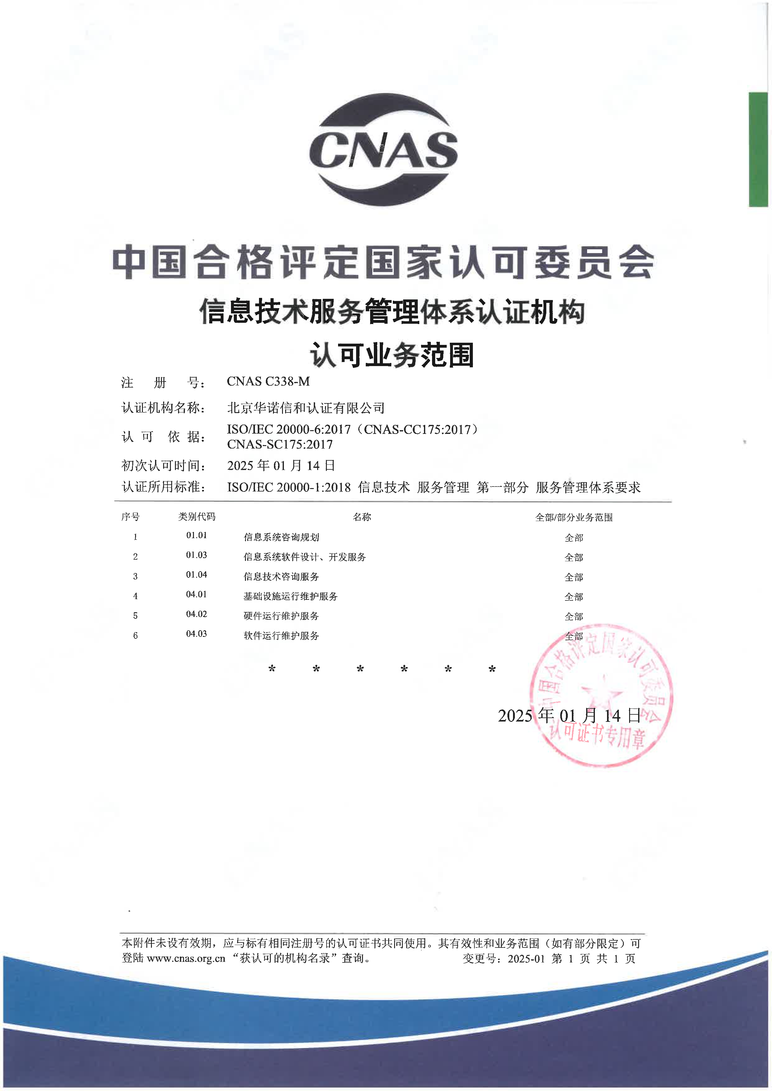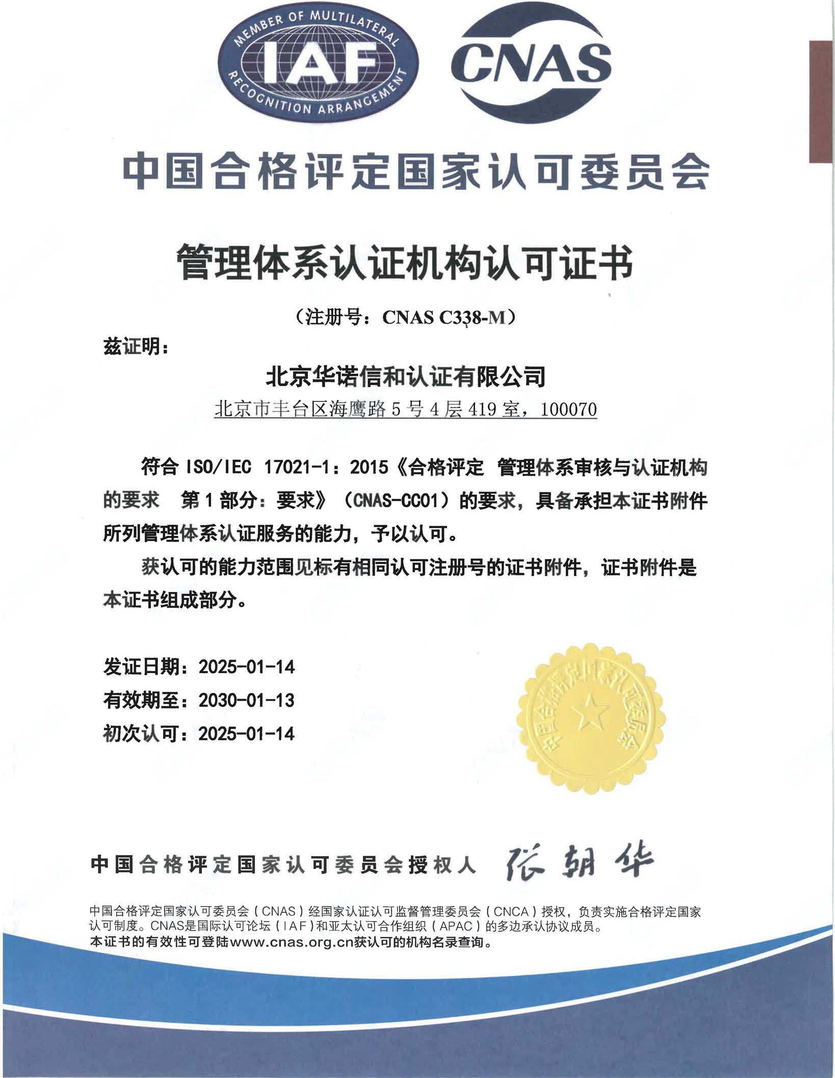 中国合格评定国家认可委员会(CNAS)已于2025年1月17日正式批准北京华诺信和认证有限责任公司质量管理体系(QMS)、环境管理体系(EMS)、职业健康安全管理体系(OHSMS)、信息安全管理体系(ISMS)、信息技术服务管理体系(ItMS)认可资格。即日起华诺信和可以在认可范围内受理并颁发带有CNAS认可标志的管理认证证书。